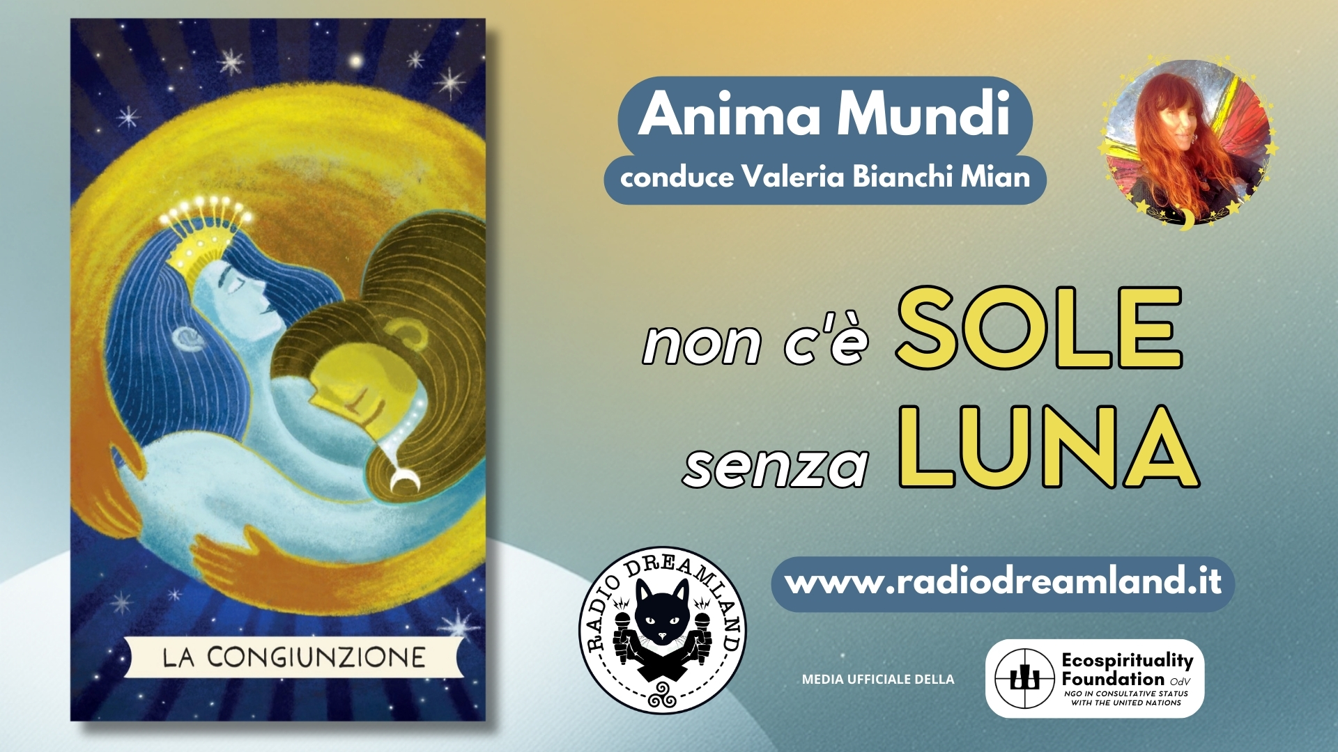 La danza armonica degli opposti, la congiunzione nei Tarocchi, come il Sole e la Luna si migliorano a vicenda. Della necessità di un eroe lunarsolare. Valeria Bianchi Mian ci conduce nella notte oscura per accogliere la rinascita della Luce, la crescita e la necessaria uscita di scena. La salute è questione di equilibrio: un po' alla Luna, e un po' al Sole, così è amore. - ANIMA MUNDI, Il venerdì alle ore 21 su www.radiodreamland.it - Questo indirizzo email è protetto dagli spambots. È necessario abilitare JavaScript per vederlo.